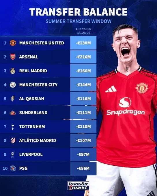 夏窗俱乐部净支出榜更新:英超狂撒币 曼联升至榜首